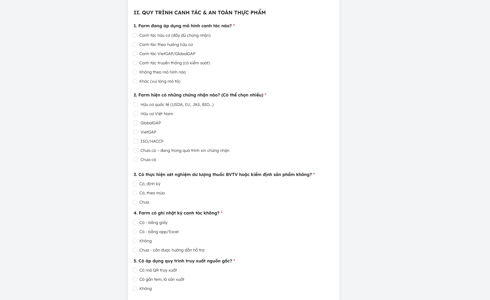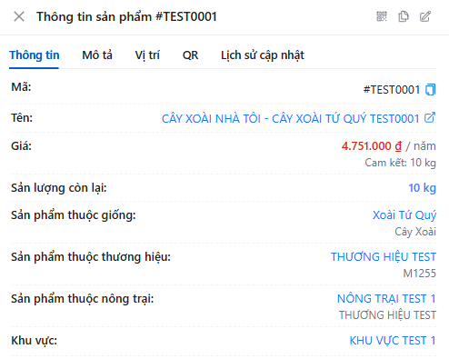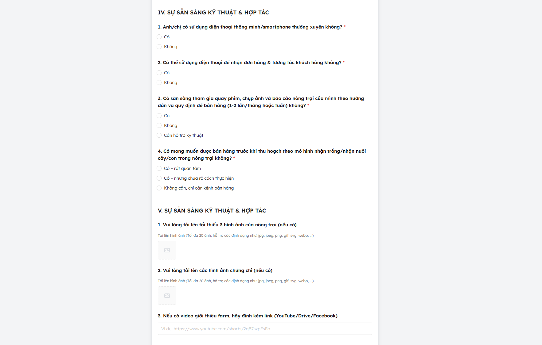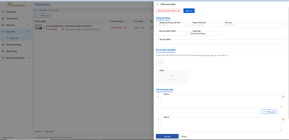 - Người bán điền các thông tin theo yêu cầu: Chọn loại cây trồng sẵn có, chọn nông trại, khu vực phù hợp, mã sản phẩm, tên sản phẩm, ảnh và video sản phẩm theo định dạng yêu cầu, tiến trình phát triển (mô tả và hình ảnh minh họa).