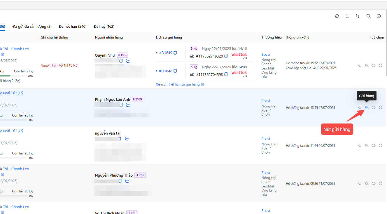 - Đến thời điểm thu hoạch, Người bán truy cập vào tài khoản người bán trên Trang quản trị của Sàn EcoNations, chọn “PHIẾU NUÔI TRỒNG”, chọn “DANH SÁCH”, chọn “GỬI HÀNG”.