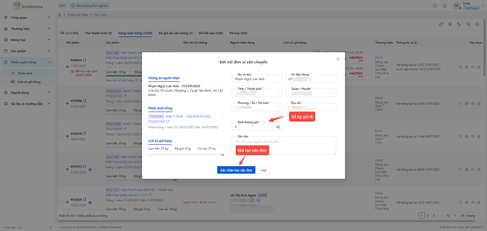 Người bán kiểm tra thông tin vận chuyển: địa chỉ, số điện thoại, số kg gửi đi, sau đó chọn “XÁC NHẬN TẠO VẬN ĐƠN” để gửi hàng đi.