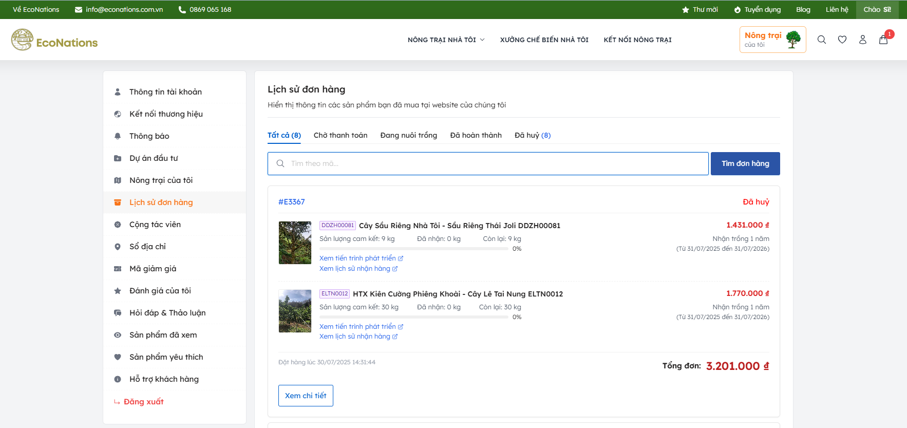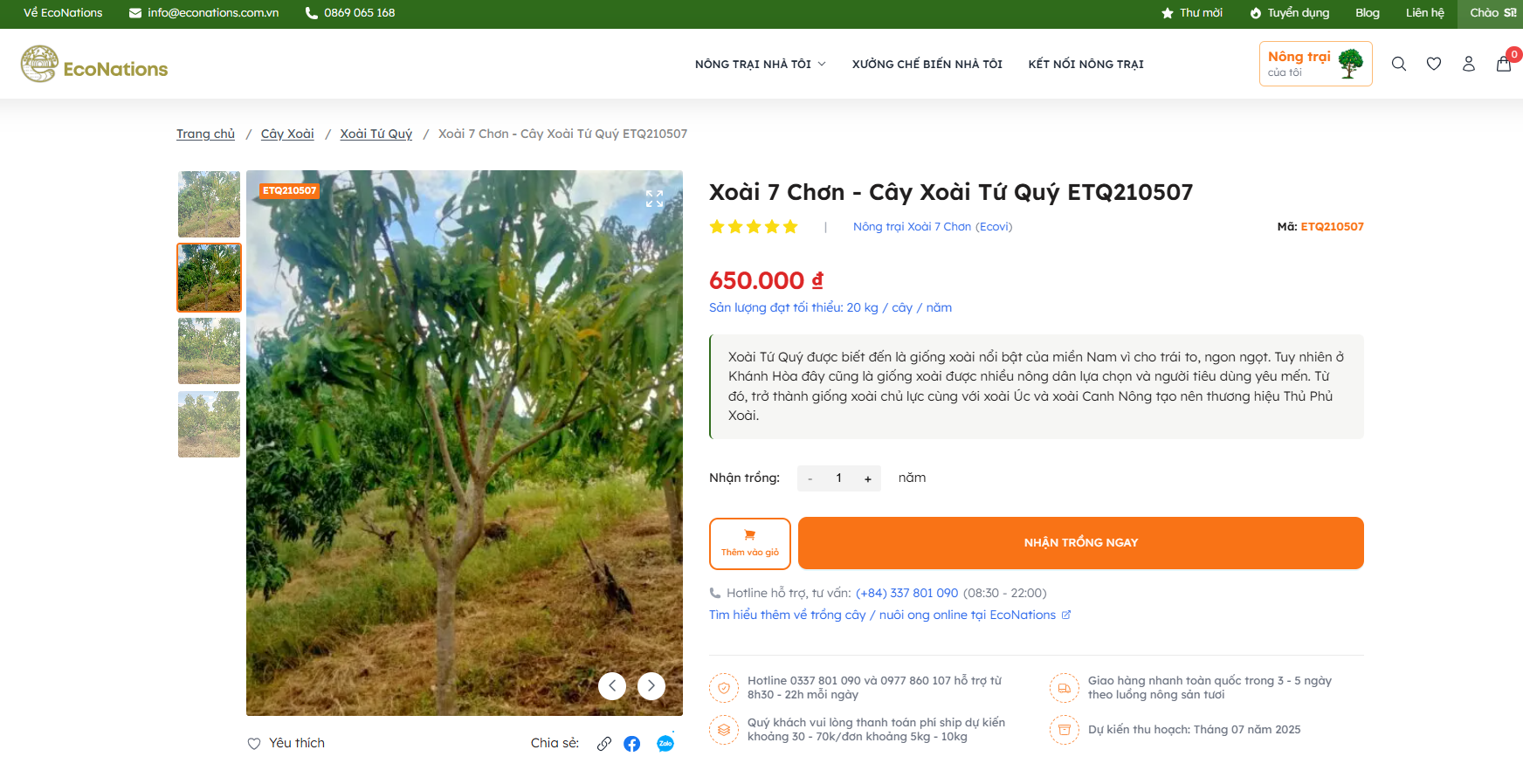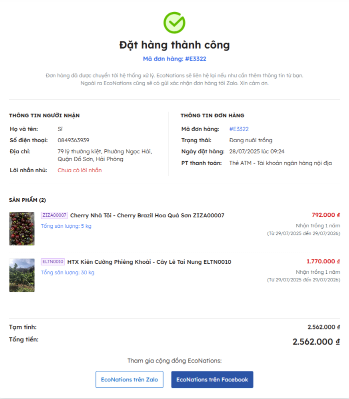 - Sau khi econations.com.vn xác nhận đơn hàng mà Người mua đã đặt hoàn tất, hệ thống econations.com.vn sẽ chuyển đơn hàng đó đến Người bán liên quan đến đơn hàng. Người bán sẽ sẽ tiếp nhận thông tin, chăm sóc giống cây trồng và thông báo và gửi thông tin cho người mua nếu người mua cần cập nhật về tiến trình chăm sóc.
