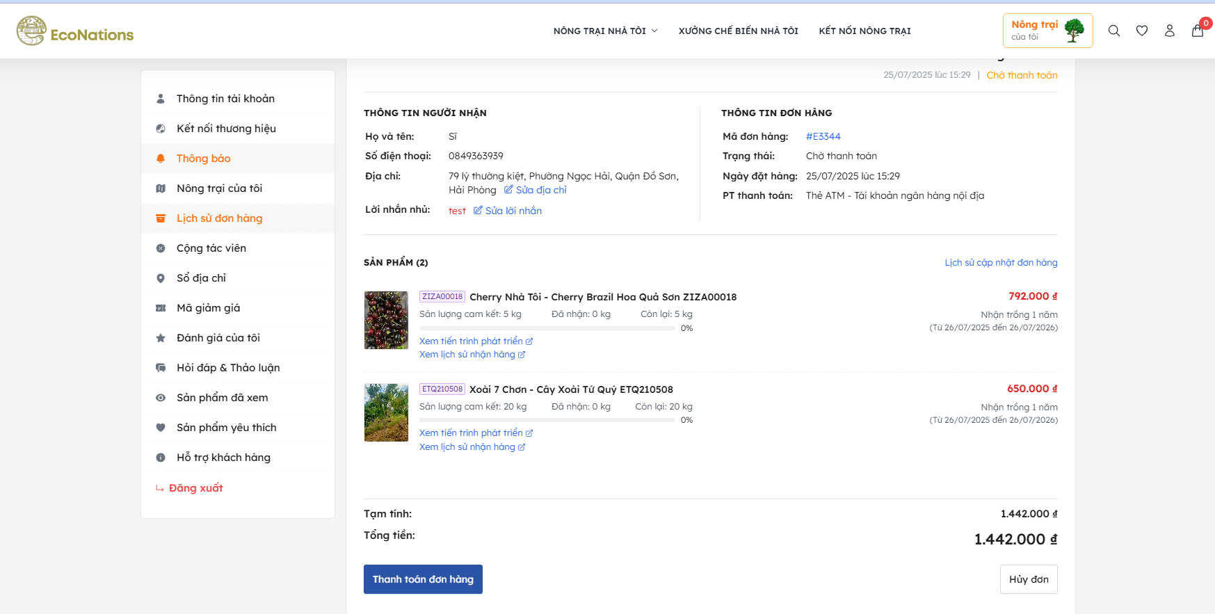 Sau khi đơn hàng được xác nhận và thanh toán hoàn tất, hệ thống sẽ chuyển đơn hàng đó đến Người bán liên quan. Người bán sẽ tiếp nhận thông tin, chăm sóc giống cây trồng và tạo đơn giao hàng khi đến ngày thu hoạch cho Người mua thông qua đơn vị vận chuyển trên Sàn EcoNations để giao hàng.