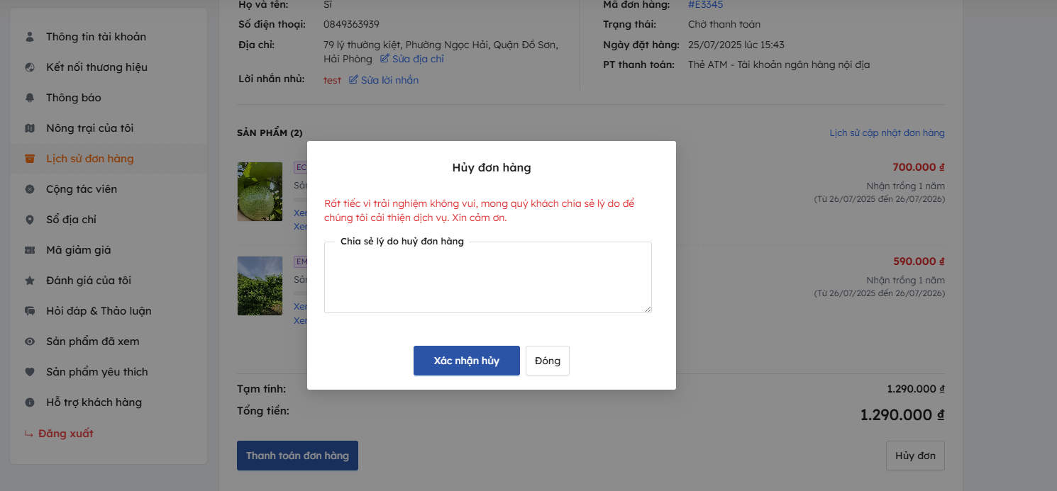 - BƯỚC 3: Lựa chọn đơn hàng cần hủy, “HỦY ĐƠN HÀNG”, nhập lý do hủy đơn hàng, và “XÁC NHẬN” để hoàn tất việc hủy đơn hàng.