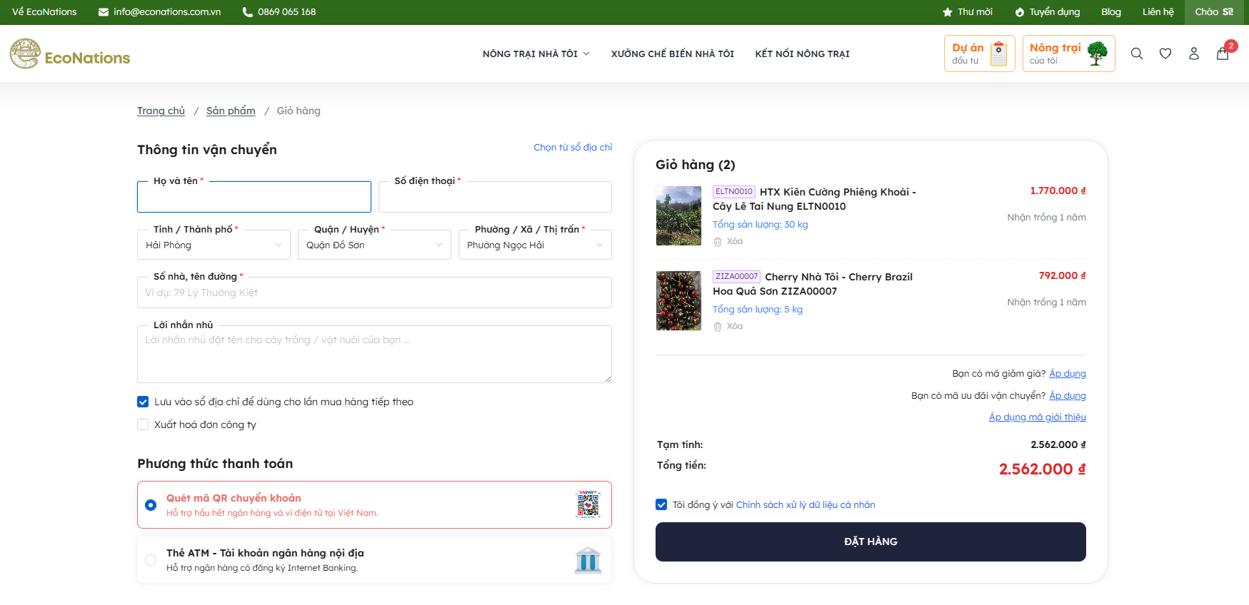 - Sàn EcoNations giao hàng trực tiếp theo địa chỉ người mua cung cấp khi thực hiện đơn hàng mua sản phẩm nông sản, cây trồng, vật nuôi. Nếu cần đổi địa chỉ giao hàng, người mua gọi theo số 0337 801 090 để được hỗ trợ.