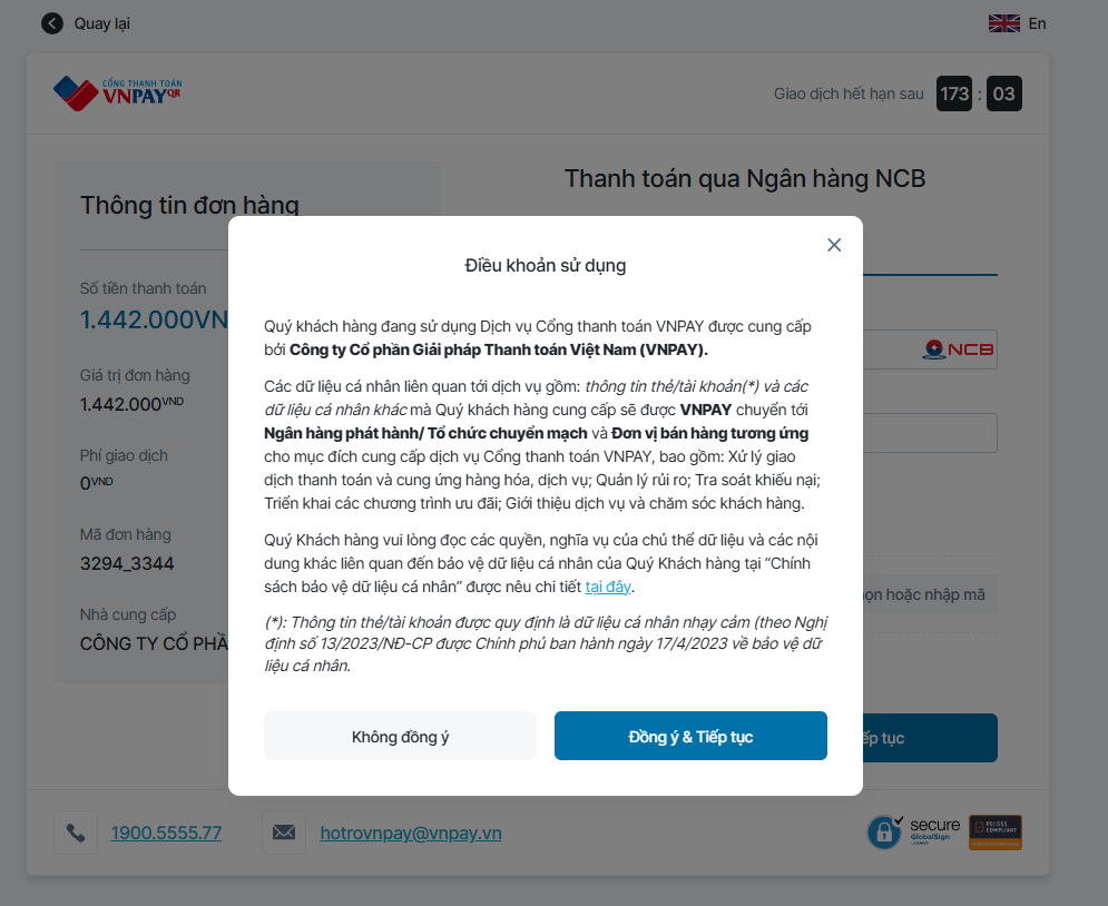Người mua lựa chọn hình thức thanh toán phù hợp, tích chọn “TÔI ĐỒNG Ý VỚI CHÍNH SÁCH XỬ LÝ DỮ LIỆU CÁ NHÂN” và chọn “ĐẶT HÀNG” để hoàn tất đơn hàng.