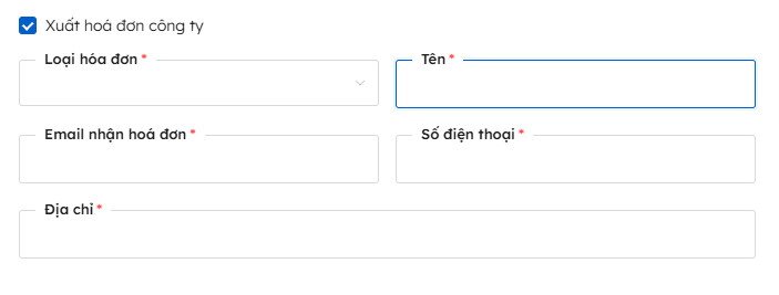 - Người mua tích chọn “XUẤT HÓA ĐƠN CÔNG TY”. Sau đó, người mua sẽ điền các thông tin theo yêu cầu: Loại hóa đơn (Công ty hay Cá nhân), Tên, Số điện thoại, Địa chỉ, Email để nhận hóa đơn điện tử.
