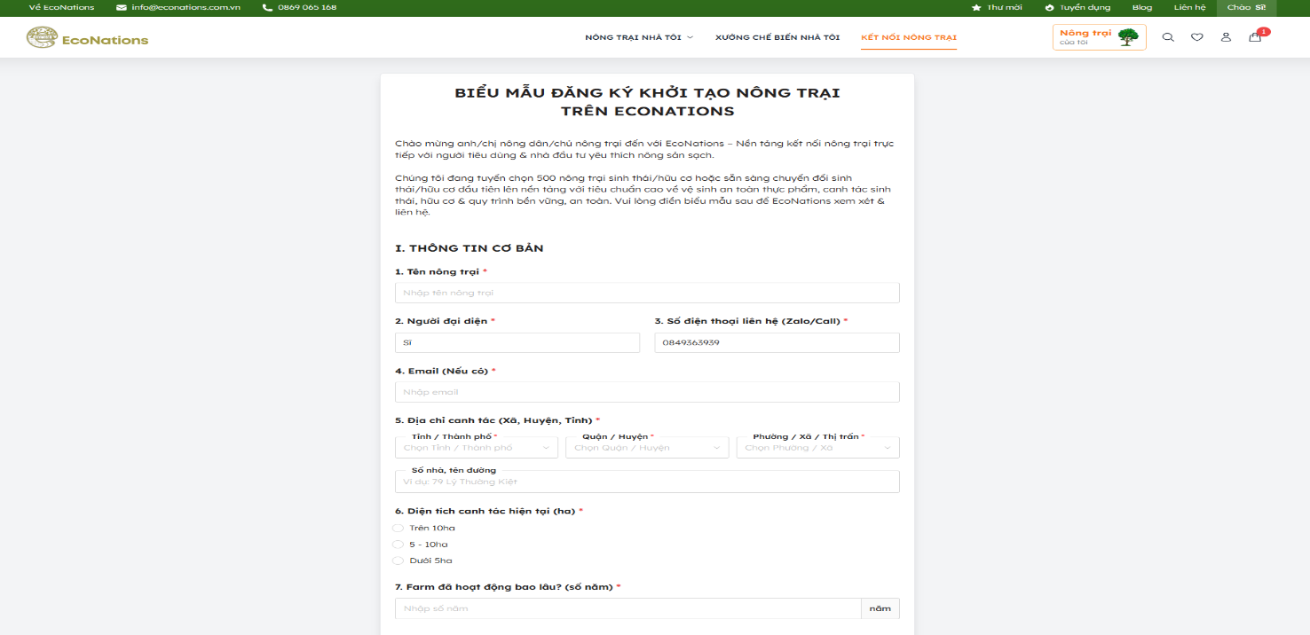 - Cung cấp các thông tin cần thiết liên quan đến Người bán cho Sàn, bao gồm: Bản sao giấy phép kinh doanh/giấy đăng ký hộ kinh doanh, giấy xác nhận nguồn gốc nông sản do Ủy ban nhân dân xã/phường nơi sản xuất cấp, giấy chứng nhận quyền sử dụng đất hoặc hợp đồng thuê đất nơi Người bán tổ chức nuôi trồng; Các chứng chỉ được cấp (nếu có): VietGap, GlobalGap, USDA…- Cung cấp đầy đủ thông tin về thương hiệu và sản phẩm mà Sàn EcoNations yêu cầu: Thông tin sản phẩm, video ảnh, tài liệu bán hàng liên quan.